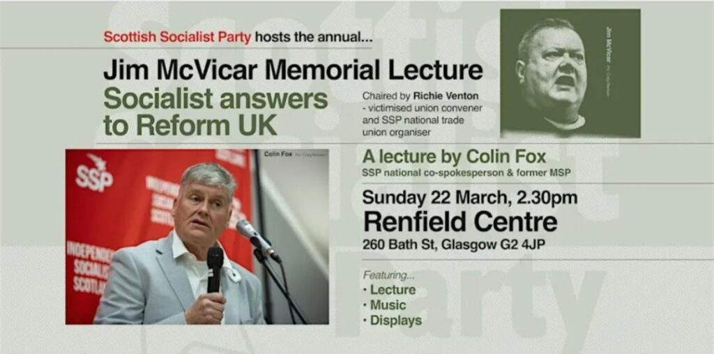 The Scottish Socialist Party will host the fifth annual Jim McVicar lecture on the 22nd of March. This lecture, entitled ‘Socialist Answers to Reform UK’ will be held in the Renfield Centre, Glasgow.